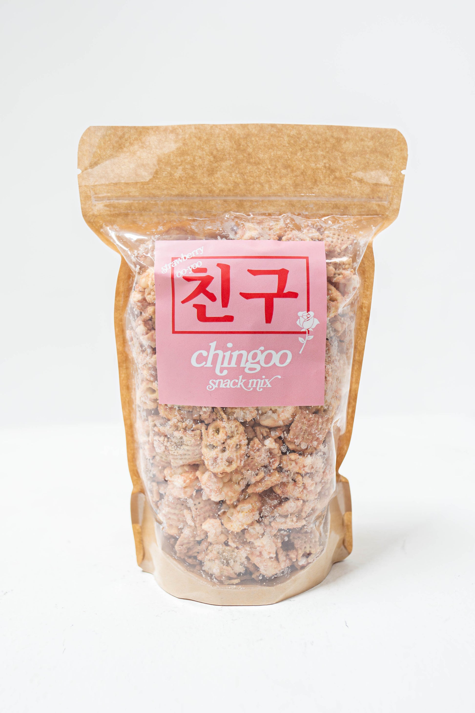 A sweet blend of chex squares, honeycomb, Korean puffed rice cracker bits (쌀과자), and a homemade strawberry cream sauce mixture