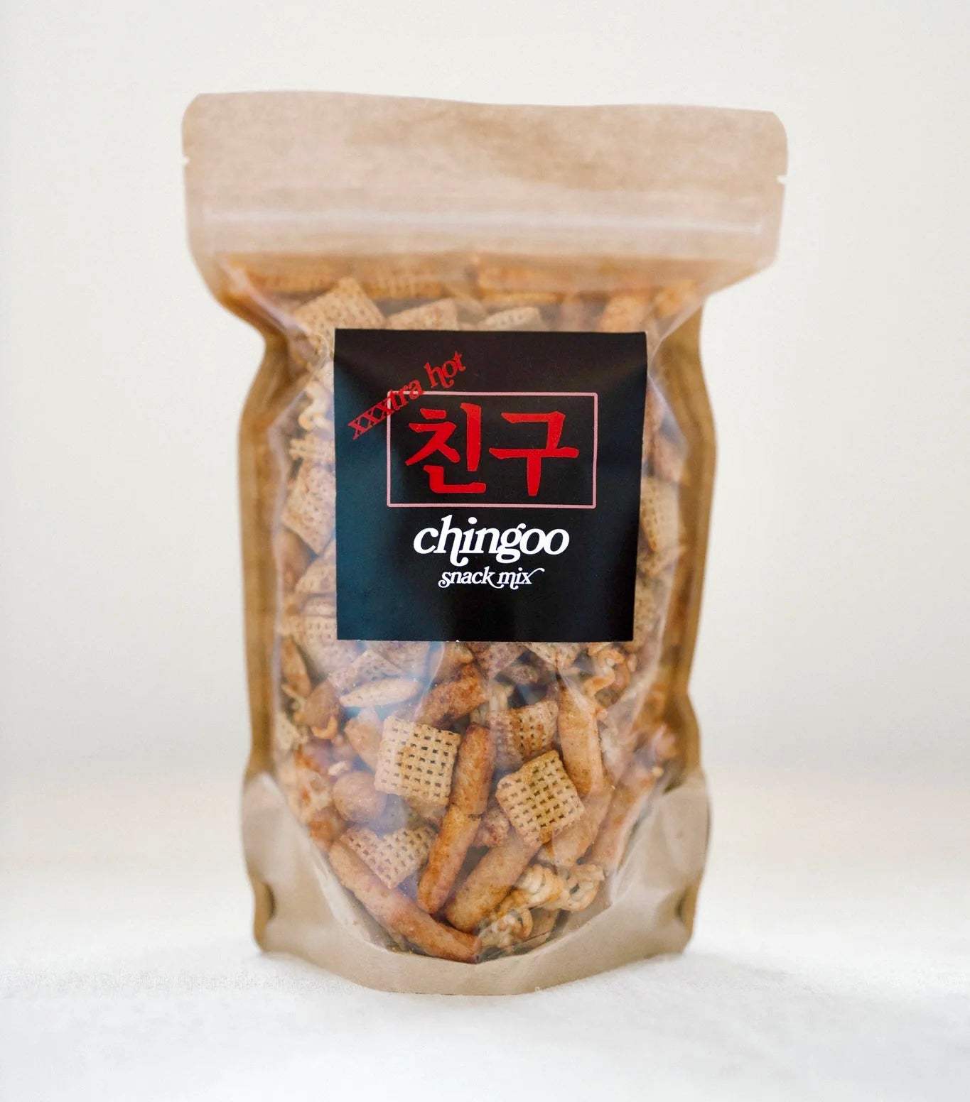 A very spicy blend of chex, sesame sticks, roasted peanuts, shrimp chips, ramen crunch bites, and a homemade extra hot gochujang sauce mixture